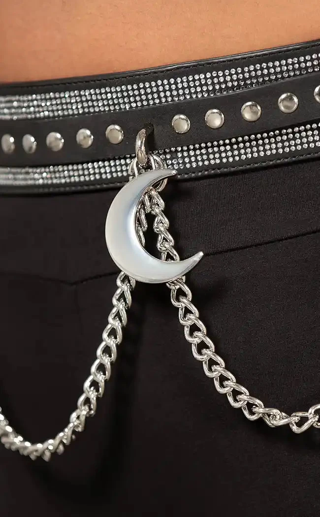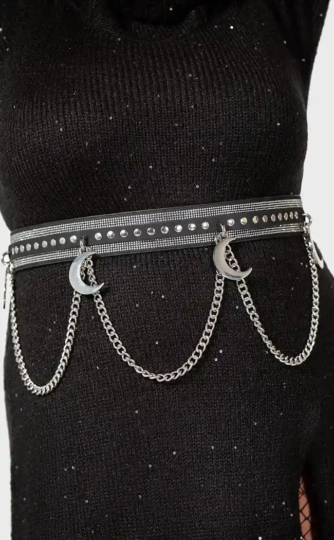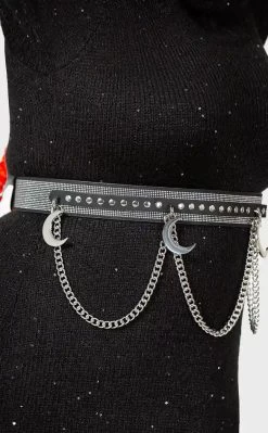 Be your witchy best in the Luna’s Levitation Belt! Luxe faux leather is decked out with diamantes and studs, chunky moon charms and dangling metal chains which detach if you need to dial down the drama.
