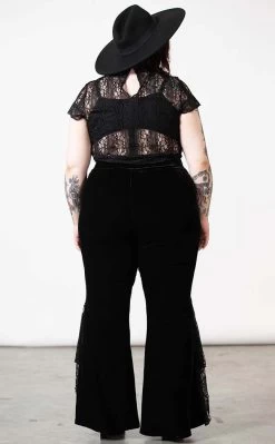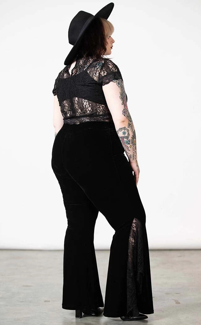Step out with an air of mystery in the Mahina Velvet Bell Bottoms. Soft, stretch velvet forms these fitted flares, featuring a high, wide waistband for a comfort fit and lace inserts that flow like liquid shadow with every step.