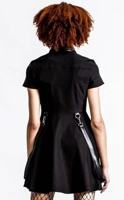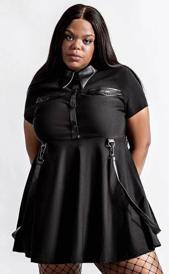 Step out in threads as black as your soul with the Menace dress! With short sleeves and a statement collar to match the removable bondage straps, there’s no end to the drama.