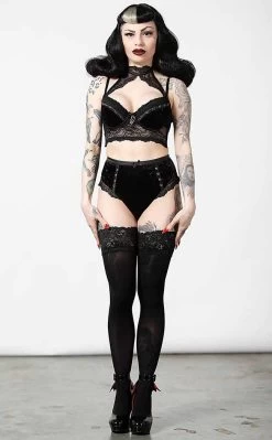 Dress to possess in the Mercy Lace Bra! Let the soft stretch velvet hug your body, trimmed with black lace and metal rivets for a touch of danger. The cups are lightly padded for extra support, connecting to a lace choker and adjustable shoulder straps.