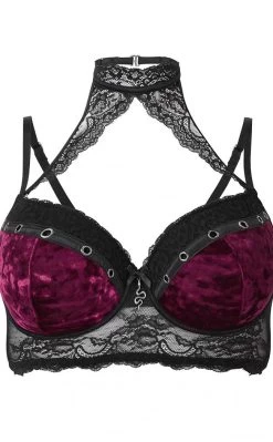 Dress to possess in the Mercy Lace Bra! Let the soft stretch velvet hug your body, trimmed with black lace and metal rivets for a touch of danger. The cups are lightly padded for extra support, connecting to a lace choker and adjustable shoulder straps.
