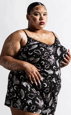 The Moonbow Cami Top is the cutest accessory a lazy goth could ask for. The adorable monochrome print is trimmed with cami straps and a lacy neckline, super sexy yet super soft for naps and quality time on the couch.