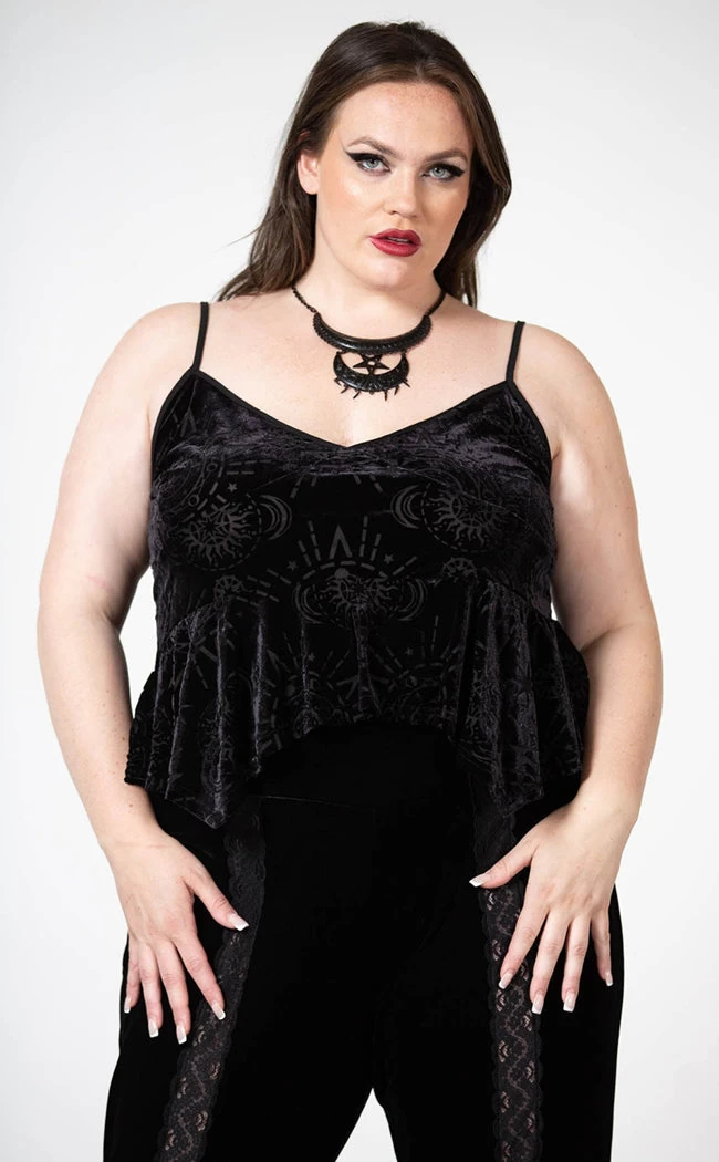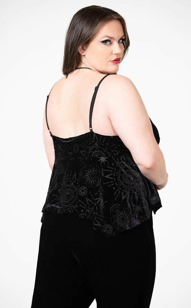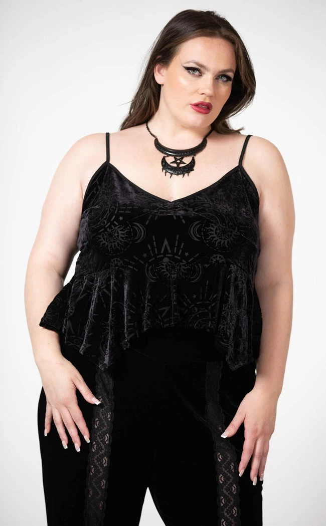 Show some skin in the Momura Strappy Burnout Top! Soft, stretch velvet features a burnout pattern of witchy symbols to have you feelin’ sexy and powerful. This forms exquisite deets like a hanky hem, an A-line silhouette, thin shoulder straps and a v neckline.