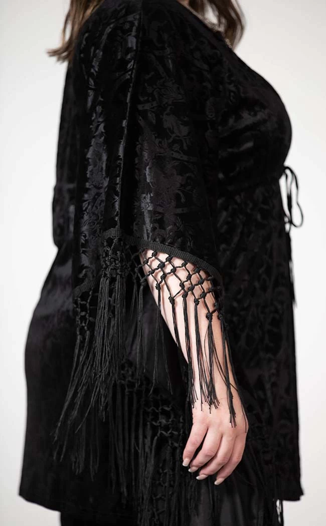 Complete your outfit the right way with the Mythic Mind Kimono. Soft, stretch velvet is embossed with an elaborate beast print, forming this relaxed fit kimono. The sleeves are trimmed with a tassel fringe and the kimono secures with a tie front.