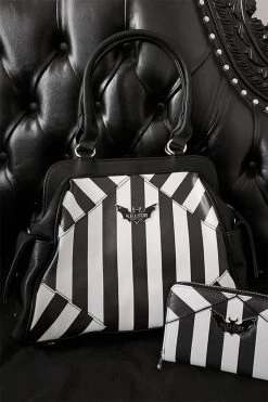 Elevate yer handbag game with this statement must-have; ‘Never Trust The Living’ is finished in a faux leather body adorned with a block-stripe print, branded bat plaque, multiple storage pockets, and zip closure. Detachable shoulder strap when you need it and of course fully lined. Halloween is every day!