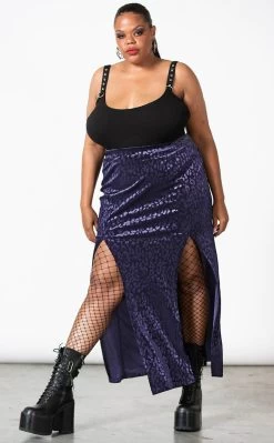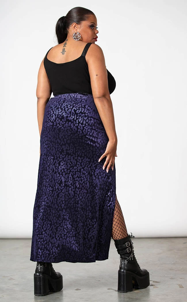 Test out yer kitty luck in the Nine Lives Skirt! This sexy maxi skirt is made from soft, stretch velvet embossed with a wicked plum purple leopard print. Sitting high on the waist, the skirt cuts into two long, sexy slits to show off yer legs.