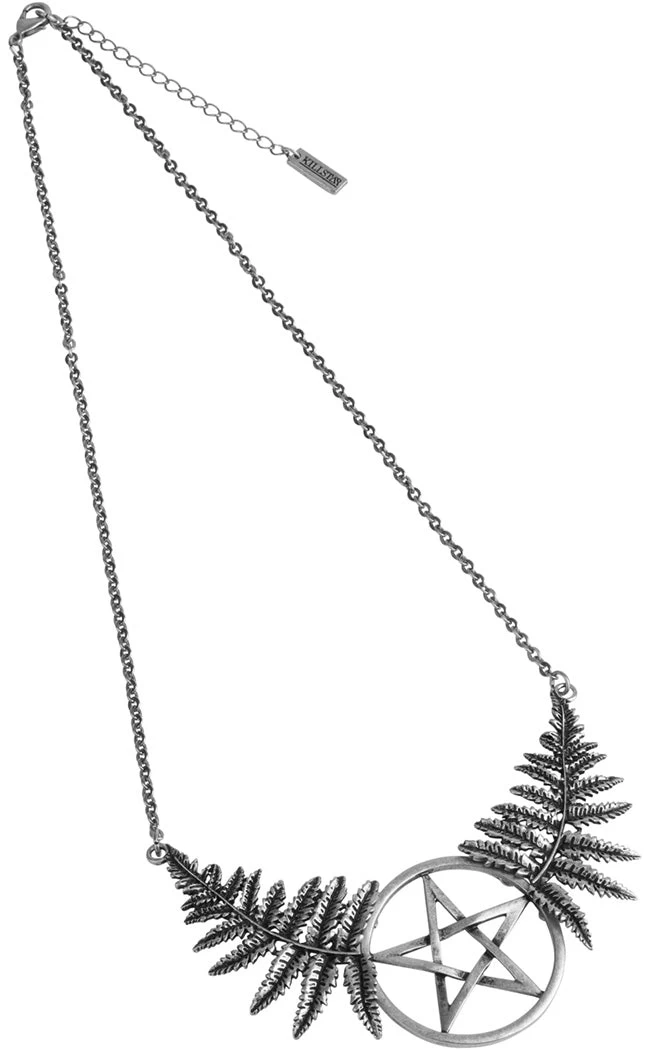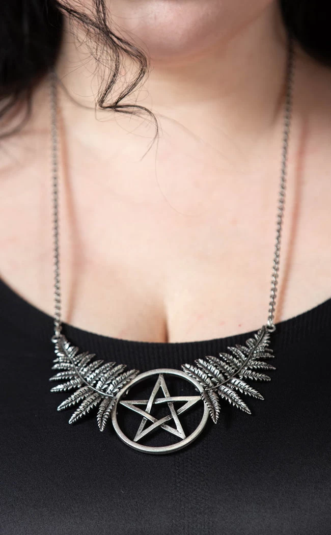 Wander through forests of fantasy in the Nixie Necklace. This beautiful necklace features a large pendant of two fern leaves supporting a pentagram charm on a long chain.