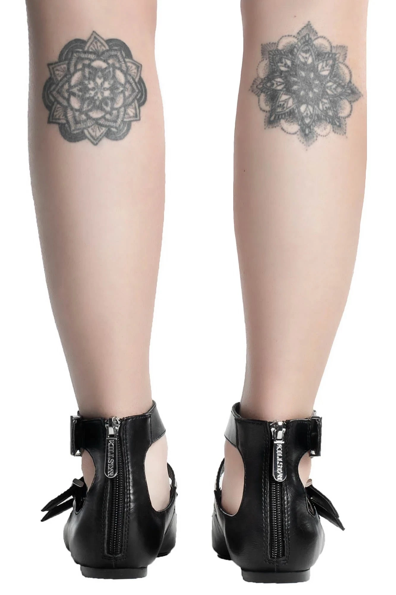 Hey, moonchild! Mesmerizing and enchanted – the ‘Oracle’ everyday-flats are the perfect match for adventures out the crypt! Soft faux-leather construction with a pointed toe body, contrasting silver moon-crescent hardware, 3-strap front and zip to the back for an easy on/off! Easy to dress up or down and perfect for yer everyday lifestyle!