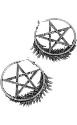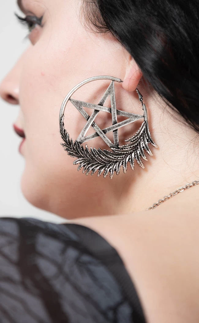 Take a dark frolic through the forest in the Penta Faune Hoop Earrings! These gorgeous statement pieces feature a hoop with a fern leaf and a pentagram at the centre.