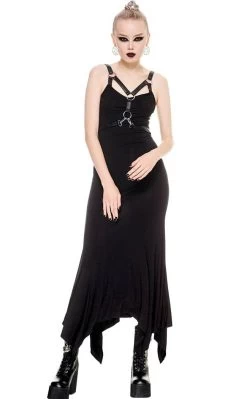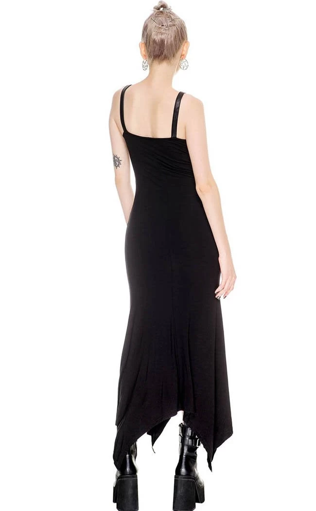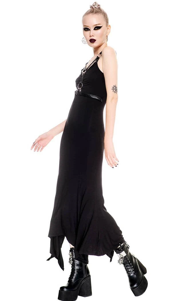 Effortless chic is the name f this sinners game-a harness chest connects to the shoulder straps of this maxi, the material soft and slinky to flow down your bod. The skirt ends in a hanky hem like tendrils of darkness circling your ankles as you stomp the streets.