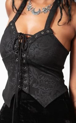 Get yer bitchin’ bodice on with the Prinna Lace Up Vest! Soft faux suede forms this halter top, featuring an adjustable lace-up front, an adjustable halter neck and statement embossed patterning.