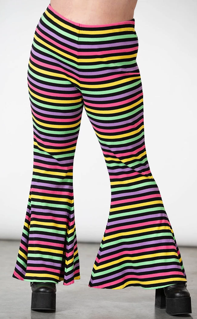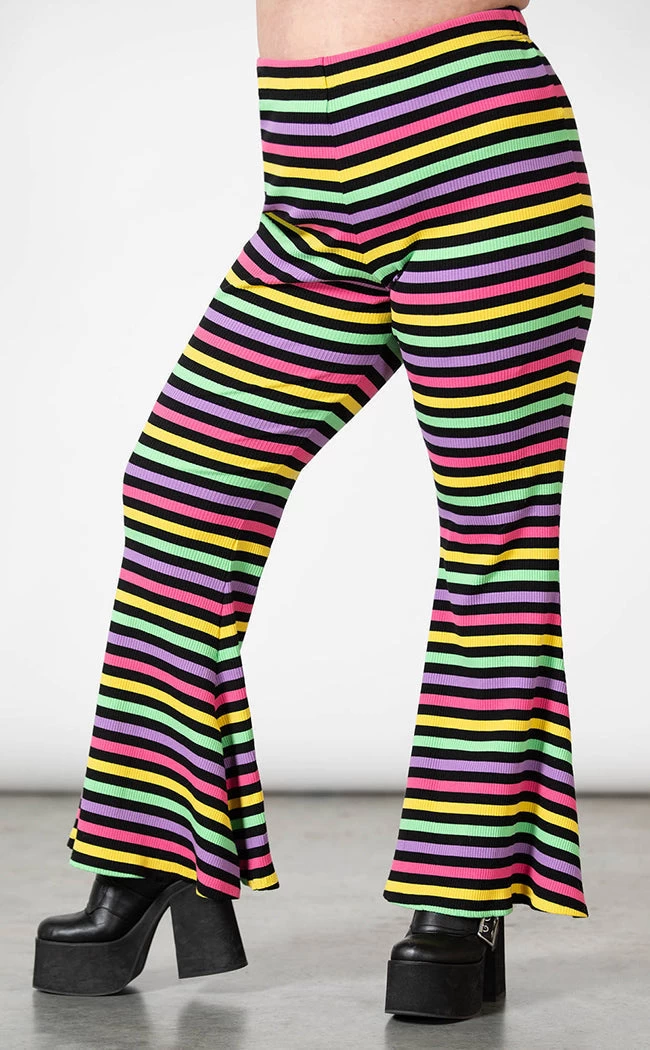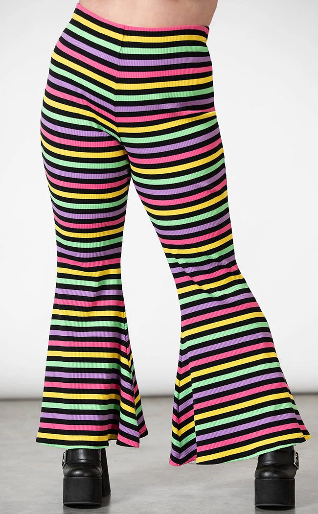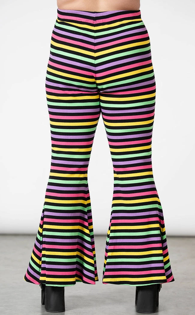 Show yer true colours! The Prismatic Flares are the rainbow rage your dark wardrobe needs; the thick, stretchy ribbed fabric is decked out with soft pastel stripes, forming a high elasticated waist and wide flared bottoms.