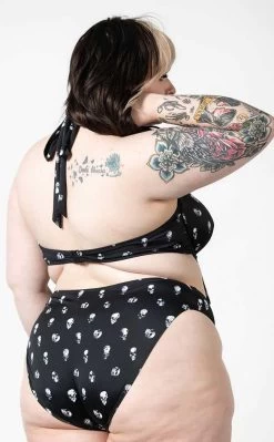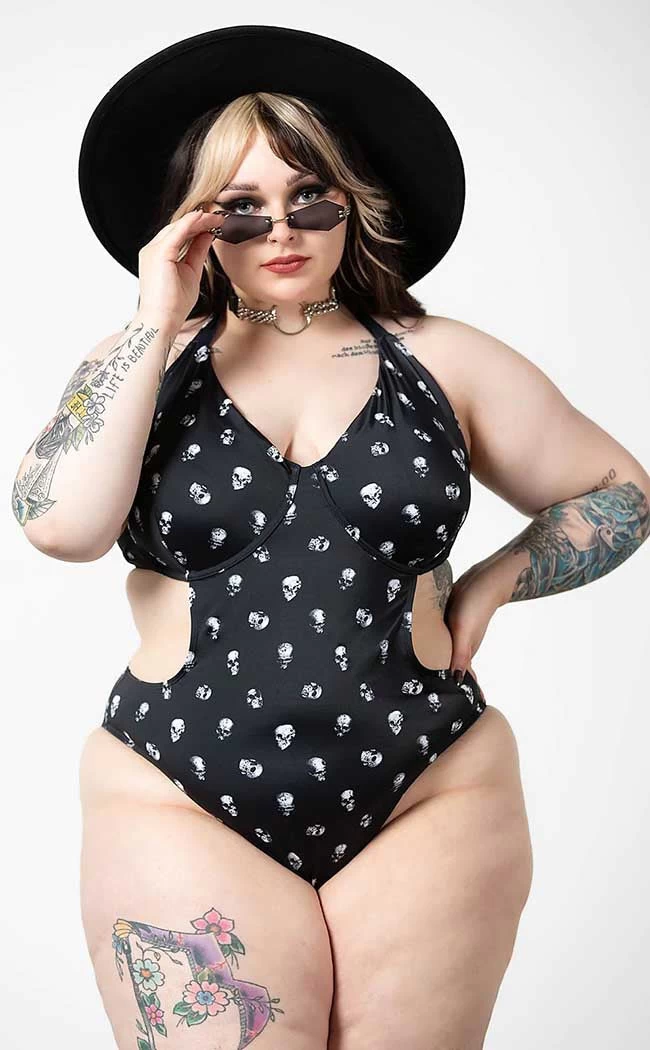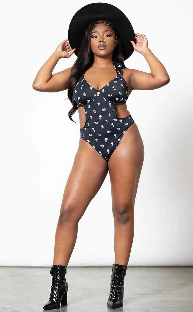 Get soaked to yer skin n bones in the Rebel Fate Swimsuit! This monokini features flattering cutouts, a halter neck, an underwire and lightly padded cups for extra support. The super-soft nylon blend fabric is printed all over with wicked skulls and the hole piece secures with a tie neck and snap back