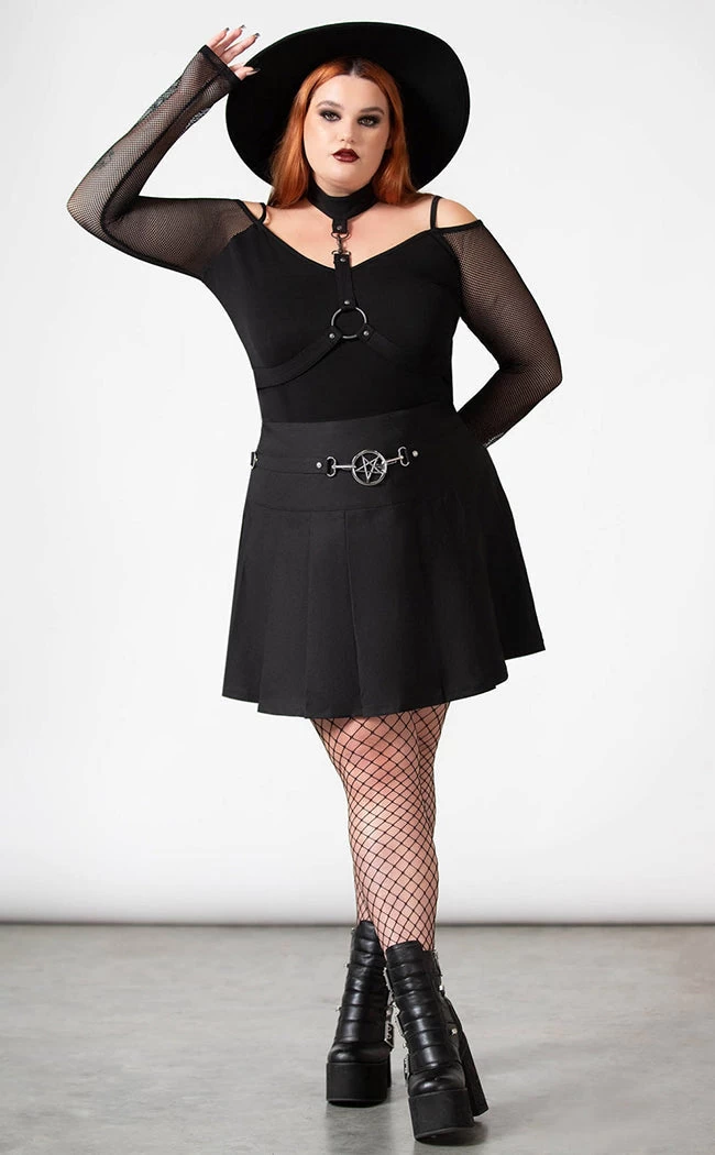 Add a little oomph to yer wardrobe with the Scary Pleated Skirt! This high-waisted mini skirt is made from soft, non-stretch fabric and features deets like large pleats and a metal pentagram at the waist.