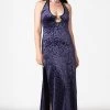 Show yer wild side in the Second Skin Maxi Dress! Soft, stretch velvet embossed with a plum purple leopard print forms a halter neckline, a long, split skirt and a cutout scoop neck decorated with an O ring.