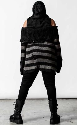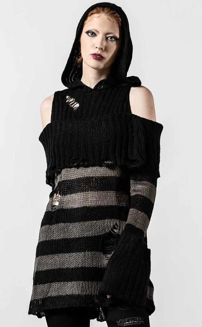 Get snug in deathly stripes with the Shallow Grave Hooded Knit Sweater. Super soft and totally vegan, this knit wraps you in a statement bardot neckline and cosy hood. The grey and black stripes feature shredded details to get ya feeling extra badass, fitting over yer bod in effortless warmth and style.