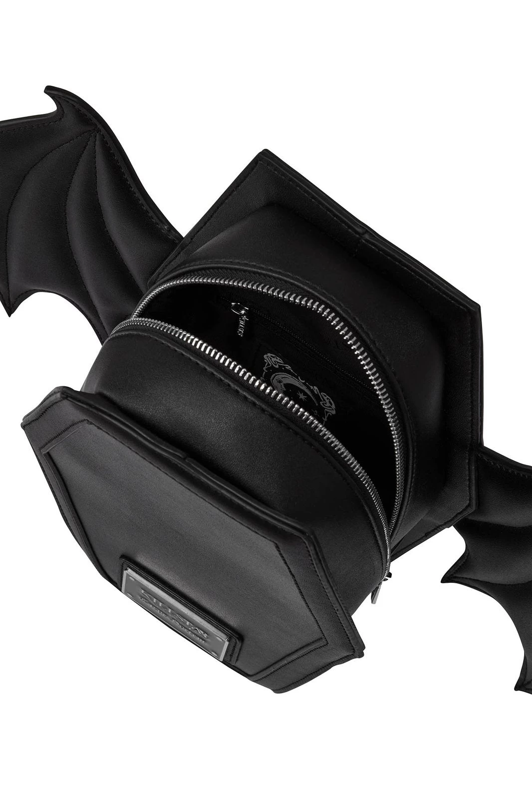 All hail the dead – this coffin-shaped ‘Sickly Sweet’ backpack ticks all yer goth boxes; side wings, slick design of vegan leather and cute backpack strap back. Doubles up like a handy shoulder bag – so u can suit yer moodz. Zip closure and fully lined.