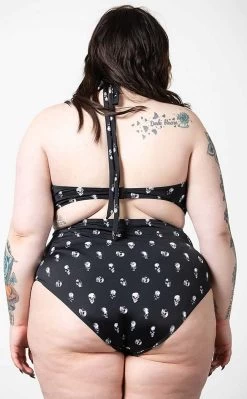 Get soaked to yer skin n bones in the Skull 2-Piece Swimsuit! This 2 piece features a high waisted bottom and a lightly padded top with an underwire for extra support. The super-soft stretch nylon fabric is covered in spooky skulls and forms a halter neck that secures with a tie while the back secures with a snap.