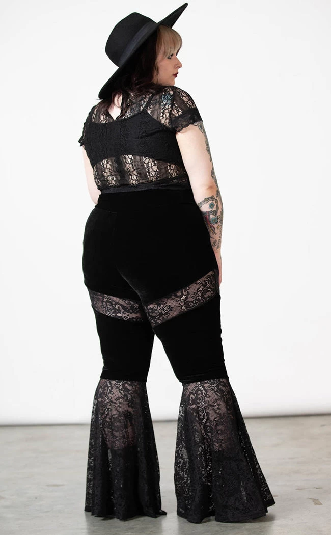 Create a spectral allure with the Solstice Velvet Bell Bottoms! These beautiful flares are formed from soft, stretch velvet, fitting comfortable with a high, wide waistband. Lace insets at the thighs create a witchy vibe to have ya feelin’ effortlessly powerful.