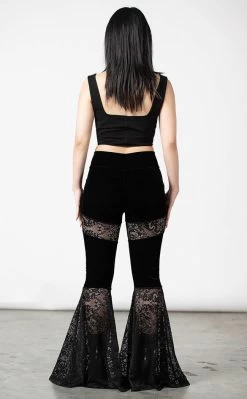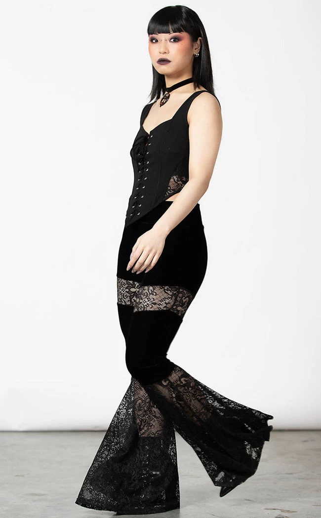 Create a spectral allure with the Solstice Velvet Bell Bottoms! These beautiful flares are formed from soft, stretch velvet, fitting comfortably with a high, wide waistband. Lace insets at the thighs create a witchy vibe to have ya feelin’ effortlessly powerful.