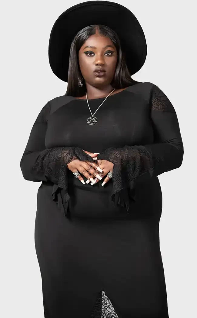 This standout black maxi dress from Killstar is made from a soft stretch see-through spiderweb lace fabric with a relaxed batwing tunic fit that drapes to perfection.