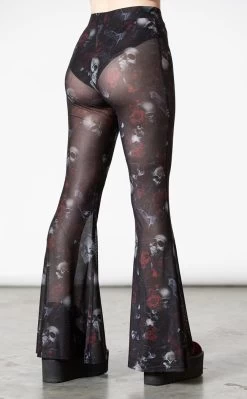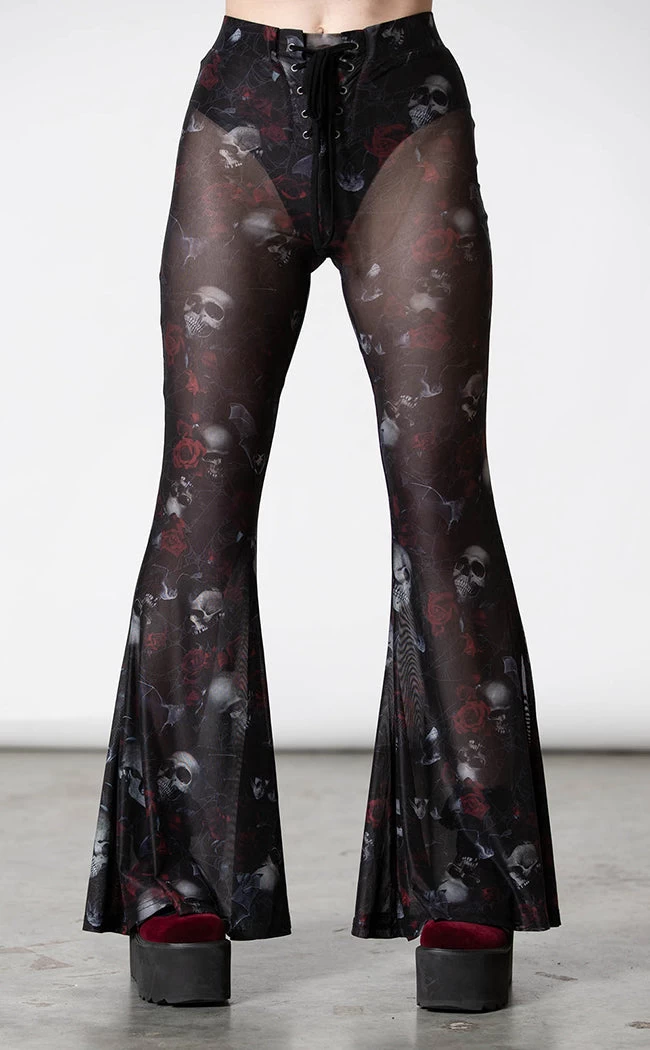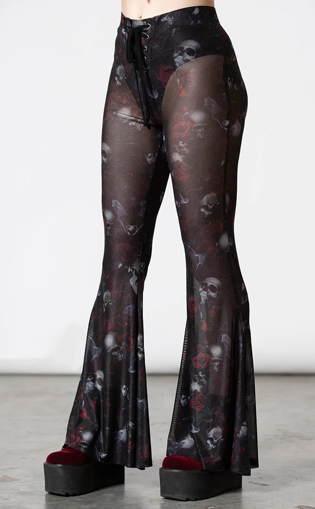 Show off yer gorgeous figure in the Spirala Mesh Bell Bottoms! Soft, stretch mesh is printed with a wicked motif of roses, skulls and bats, forming into flowing bell bottoms. The waist is elasticated for a comfortable fit. The bell-bottoms also feature a lace-up panel and come with panty lining for yer (im)modesty.