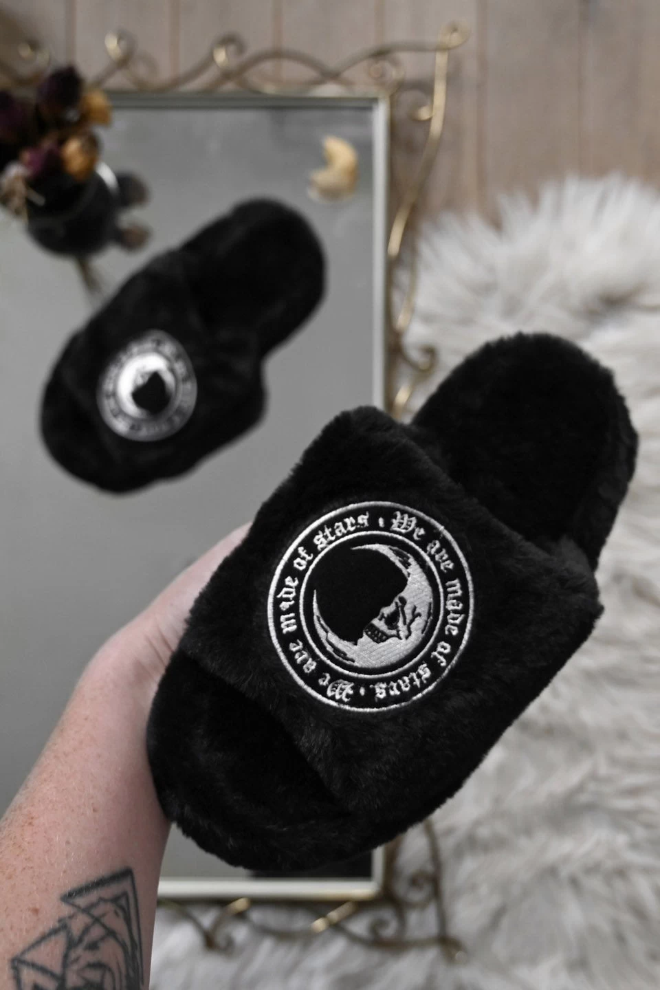 – Statement faux fur slippers.
