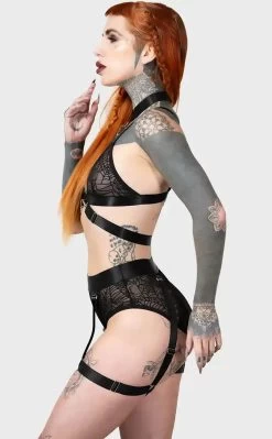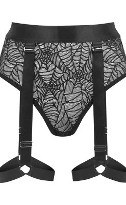 Haunt their dreams or star in their nightmares in the Killstar Tangled Panty! Conjured from soft, stretch custom spiderweb lace, this beautiful panty features harness style straps, metal hardware, and a cotton-lined gusset. The suspender harness straps are elasticated, adjustable and can be detached depending on your mood.