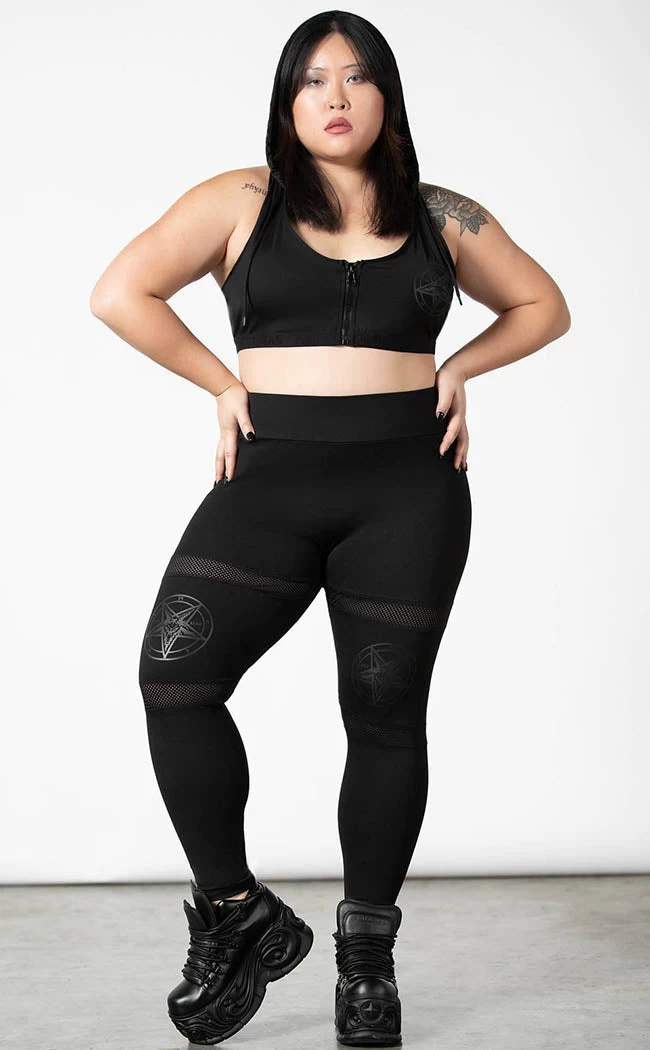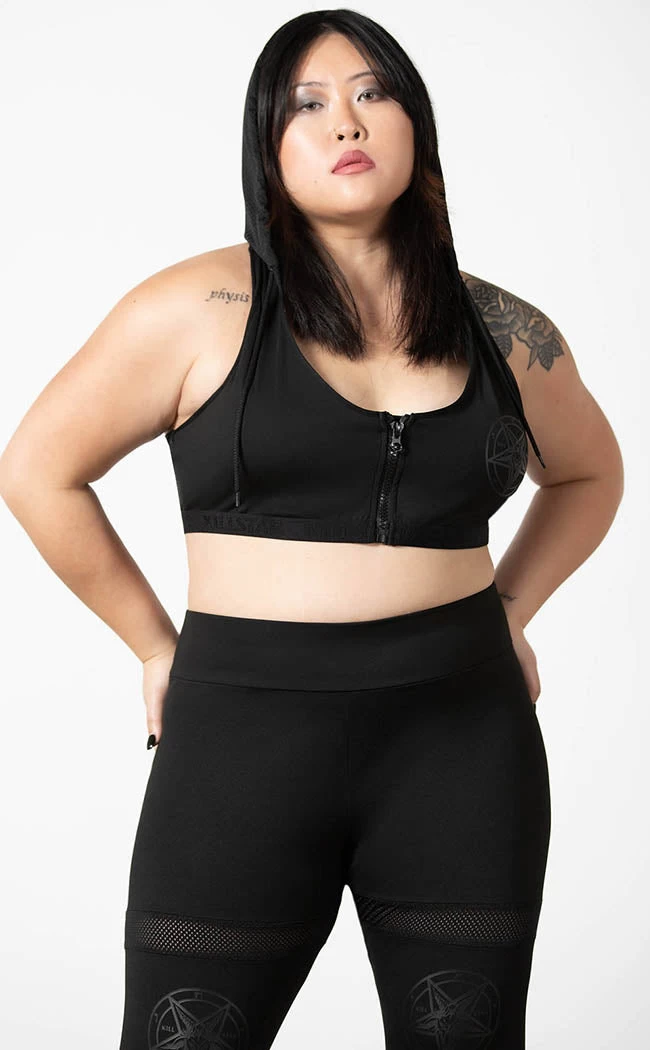Put an end to dull activewear with the Terminus Sports Bra! This unique bra features a mesh hood and racerback, making a bold statement while being practical and super breathable. Extra deets like a Killstar branded elastic band, a pentagram motif and a handy zip up front complete the look.