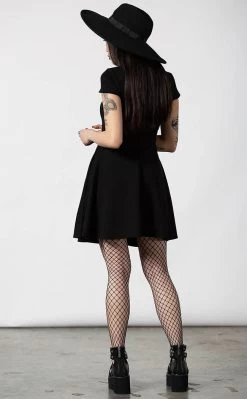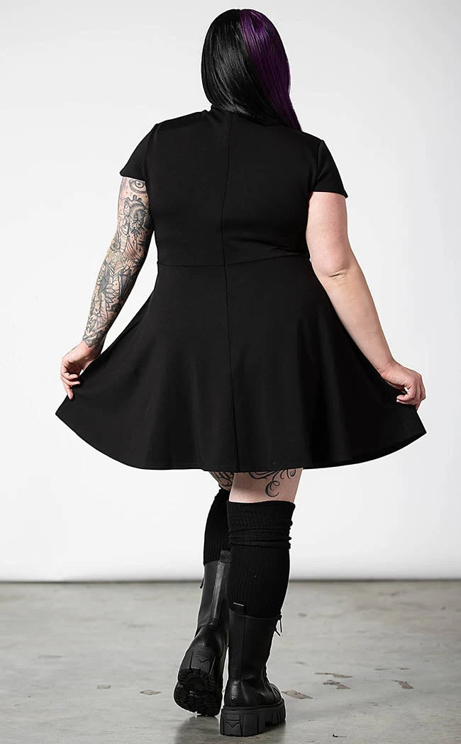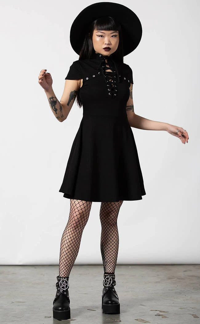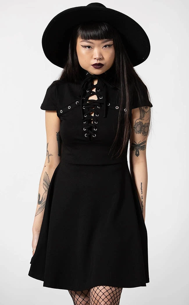 Get caught up in yer own web with the Tied Up Skater Dress. This deceptively simple dress was conjured from super soft fabric that stretches to the perfect fit. The neckline laces up, featuring a high neck, rivets and cap sleeves.