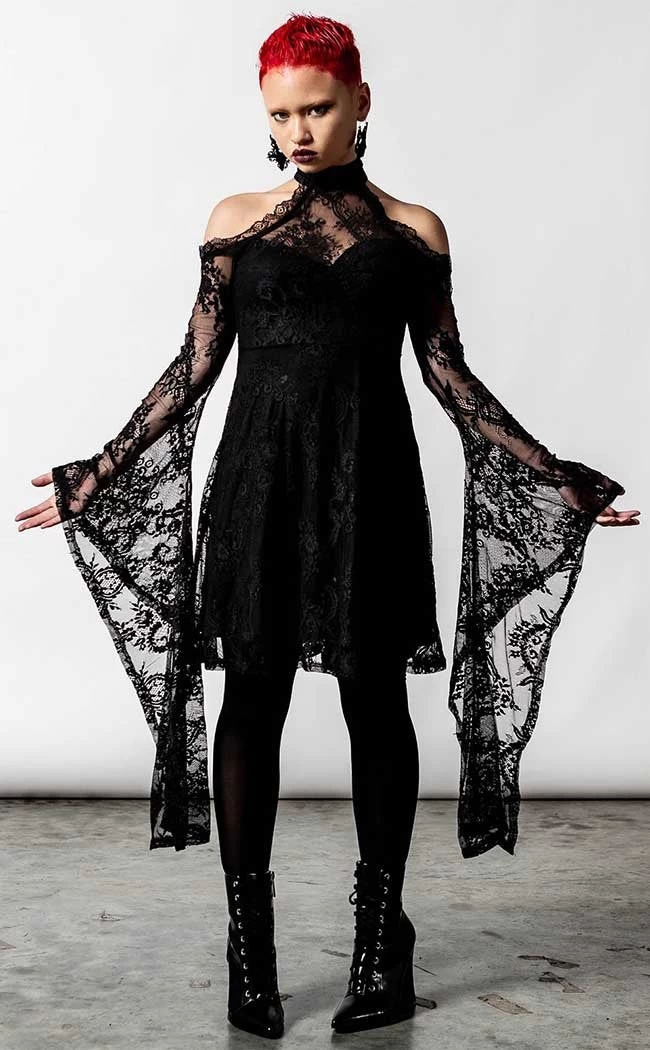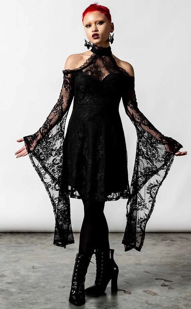 Become the peak of witchy glamour in the To Dust Kimono-Sleeve Dress! Super soft stretch lace follows your figure, creating a flattering yet unique silhouette thanks to the dramatic kimono sleeves. A halter neck and cold shoulders show just the right amount of skin, perfect for enchanted evenings and appearing in your enemies nightmares.