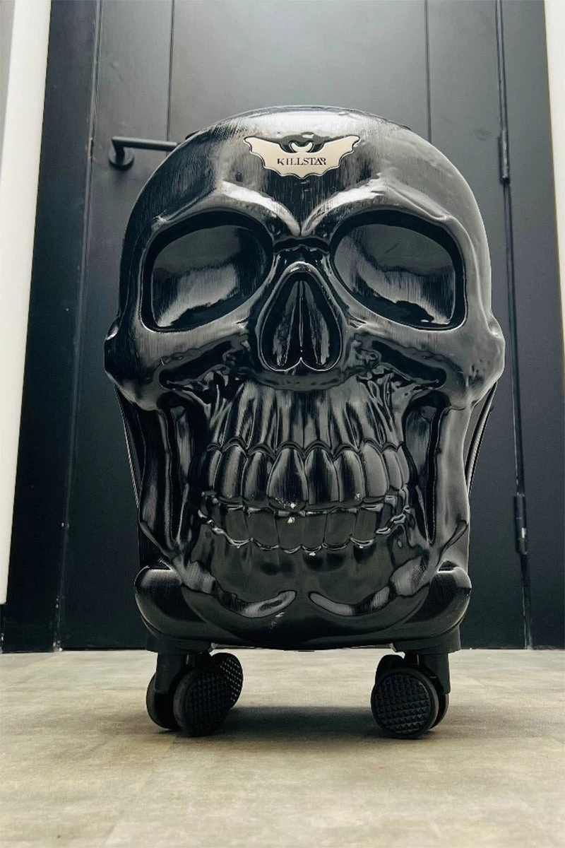 Bring a bit of magic on yer adventures out the crypt. Our ‘Tomb’ travel suitcase will sure cause a stir on your trips to Transylvania. Hard protective case in a custom skull mold, collapsible handle and four wheels so you can be on a constant roll. All black like your soul! With zip closure, multi compartments and just the right size for your carry-on.