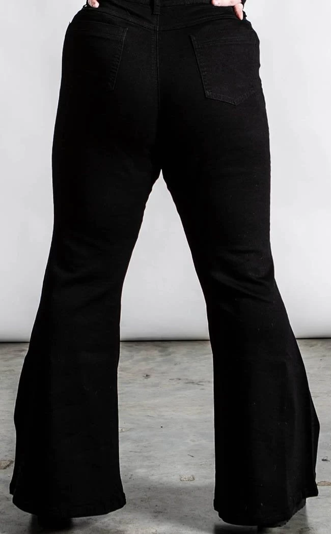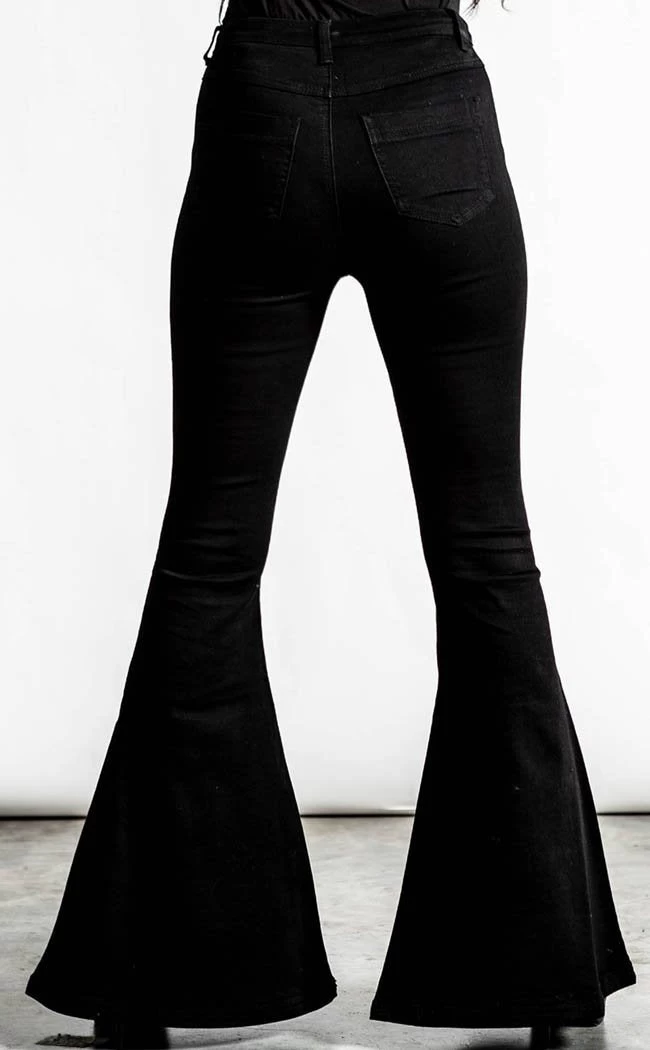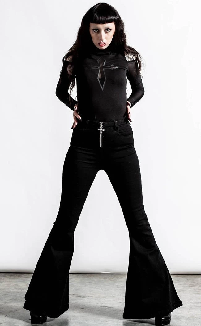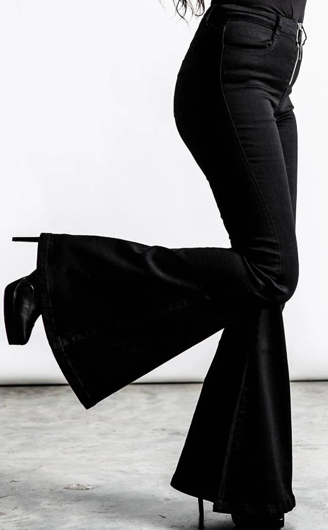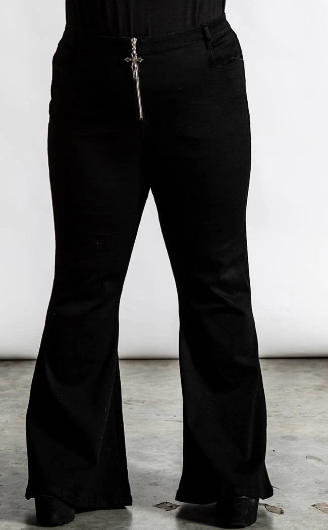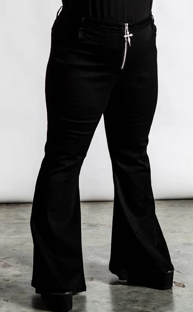 These gorgeous trousers are super long, ideal for wearing with heels, platforms or for those of you with legs up to *here*. The high waist features belt loops and a statement cross zip while the legs flare into generous bell bottoms.
