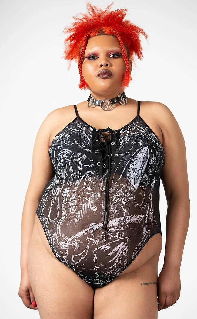 Show off yer bod in the Violenta Lace-Up Bodysuit! Soft, stretch mesh is printed with a wicked, demonic motif to make one hell of a statement. The shoulder straps are adjustable, the neckline features a sexy lace-up detail and the gusset is cotton lined for comfort.