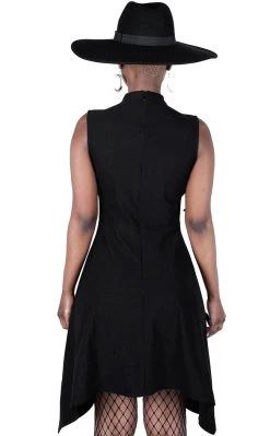 The statement lace-up high-neck on this dress peeps over an edgy cutout on the chest for dark priestess vibes. The skirt fits and the wist and flares with its soft-touch stretch fabric, ending in an uneven hem.