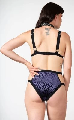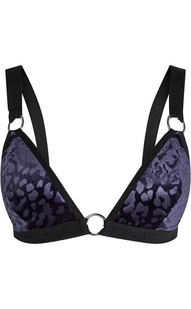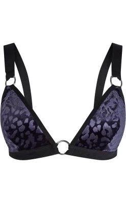 Break hearts and take over minds in the Wicked Game Bralet! Soft, stretch velvet is embossed with a luxe plum purple leopard print, framed by high stretch shoulder straps and metal hardware. Secures with a hook and eye closure at the back.