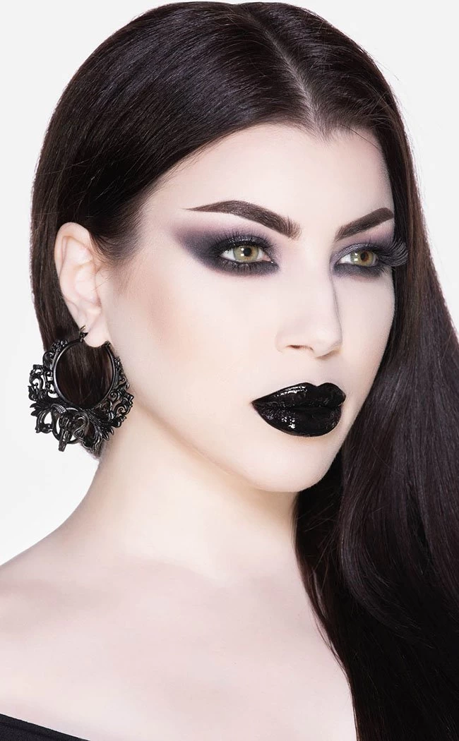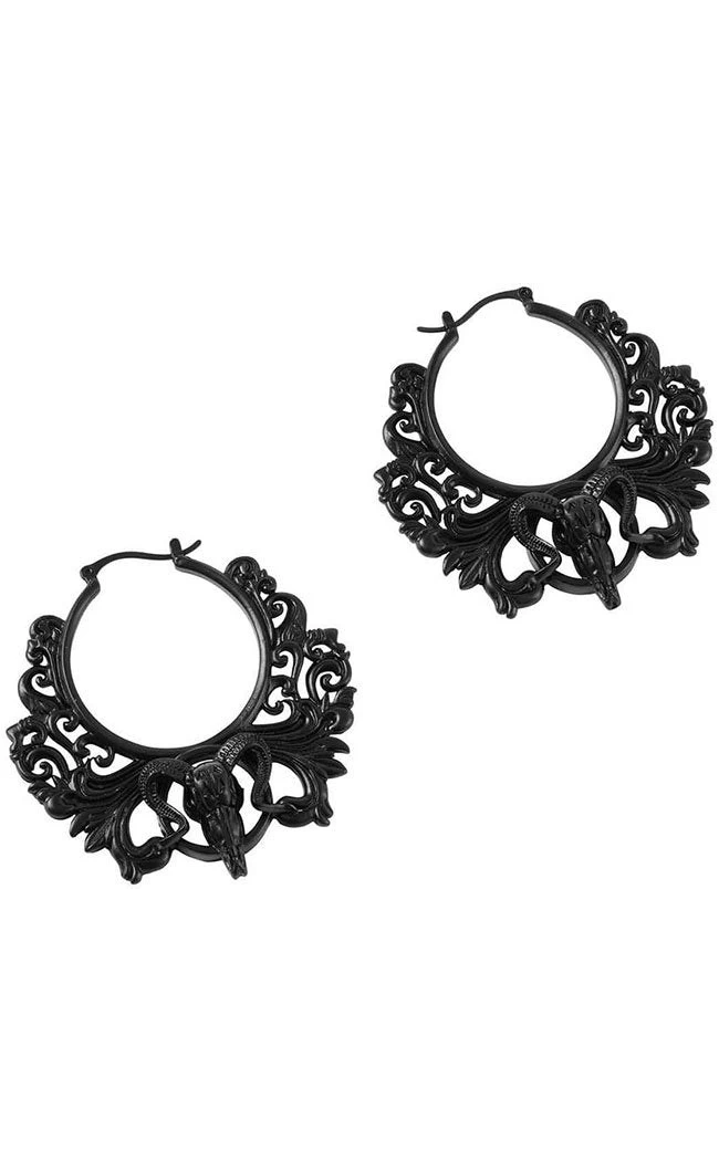 Party like the sun don’t shine with these elegant af earrings! Intricate filigree patterns hang from the hoops, wrapping around a goat skull for glamour with a touch of death. The earrings are an alloy metal with a reinforced design, finished in shining black.