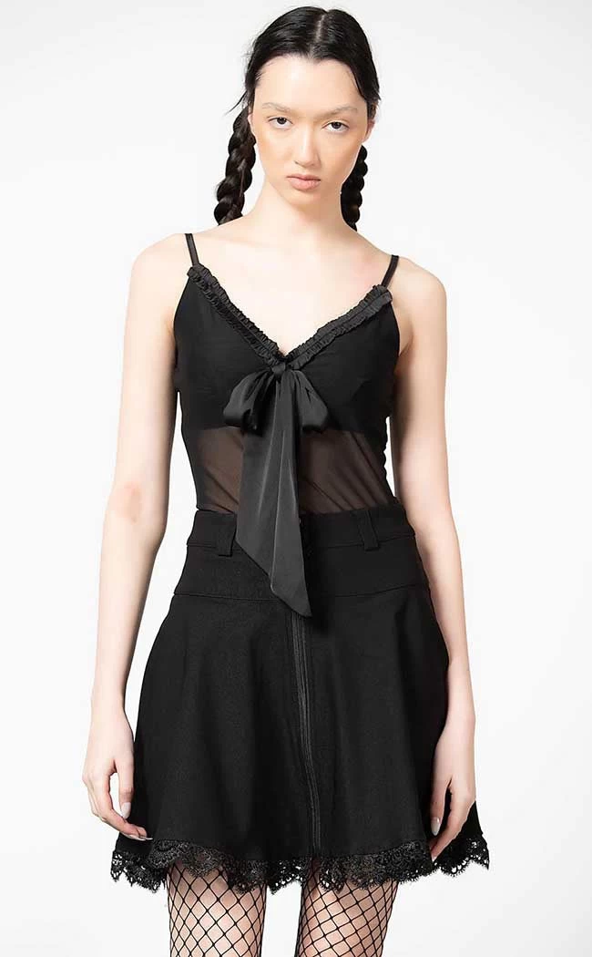 The Yuna Ribbon Mesh Top will have you lookin’ cute in a snap! This soft mesh tank features thin, adjustable straps, frill trims and a large, statement chiffon tie. The chest comes with non-padded opaque cups so you can wear this piece alone or with boleros and fishnets.